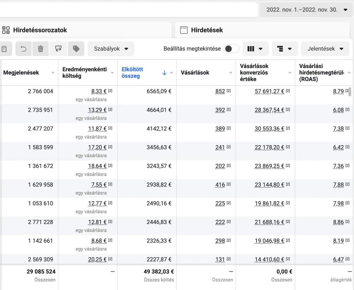 Itt pedig egy nemzetközi webshop novemberi Black Friday kampány eredménye, ahol közel 50.000 eurót hirdettünk el nagyjából 7x-es megtérüléssel. 🤯